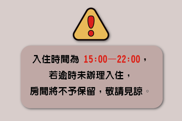入住時間 : 15:00-22:00 退房時間 : 11:00