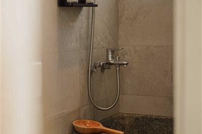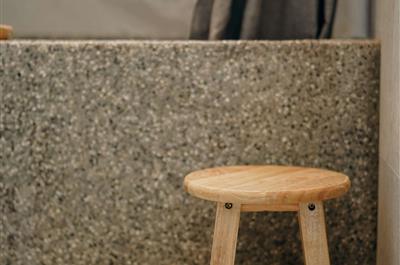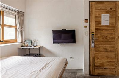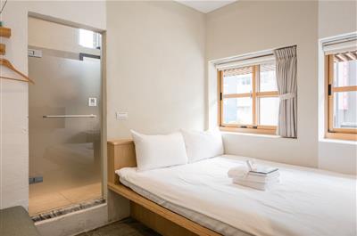 日式房型,木質床鋪有雙人記憶床墊,部分日式客房將原有浴缸重新舖設洗石子,坐在小木製凳,用木勺洗浴,讓旅行者有一個很好記憶點。